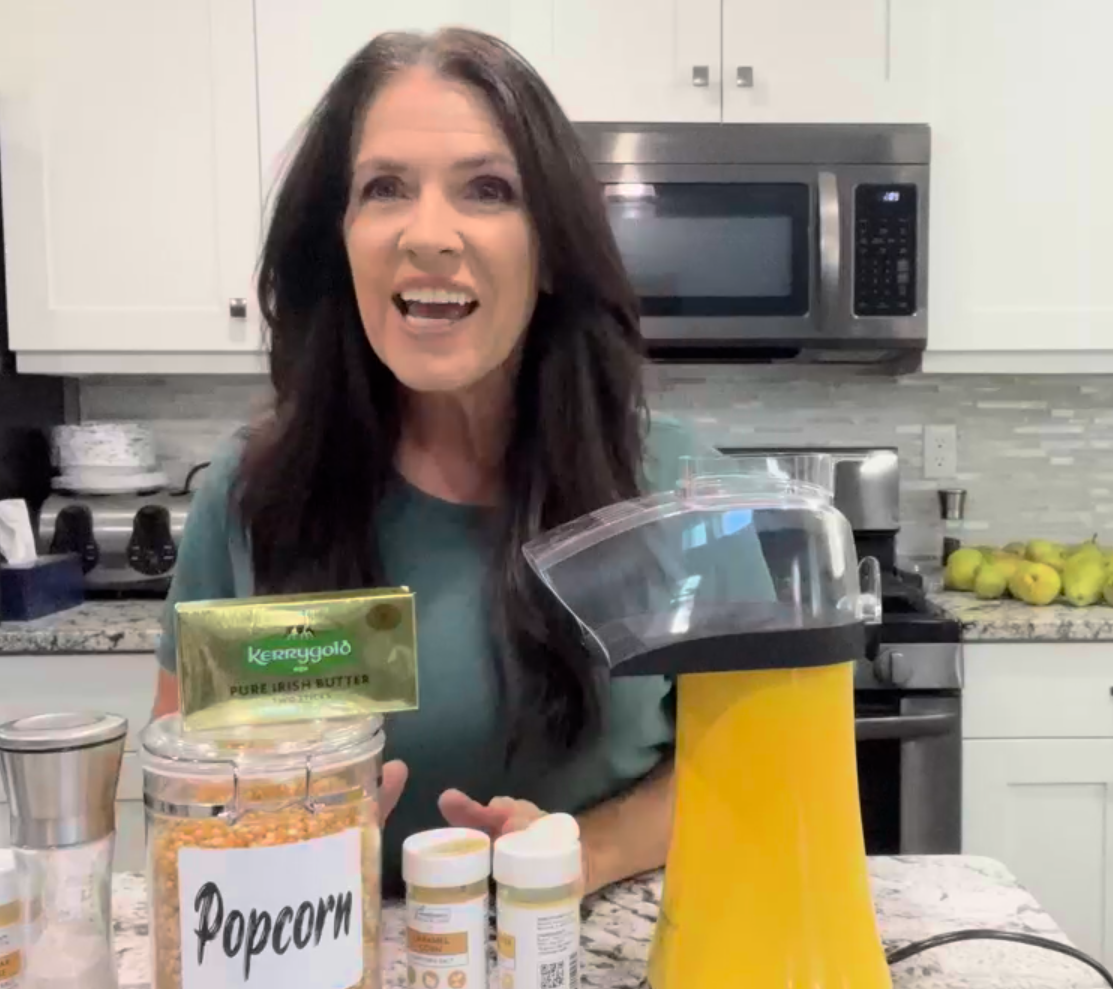 The machine produces up to 4 quarts per batch — enough for family movie nights or small parties.